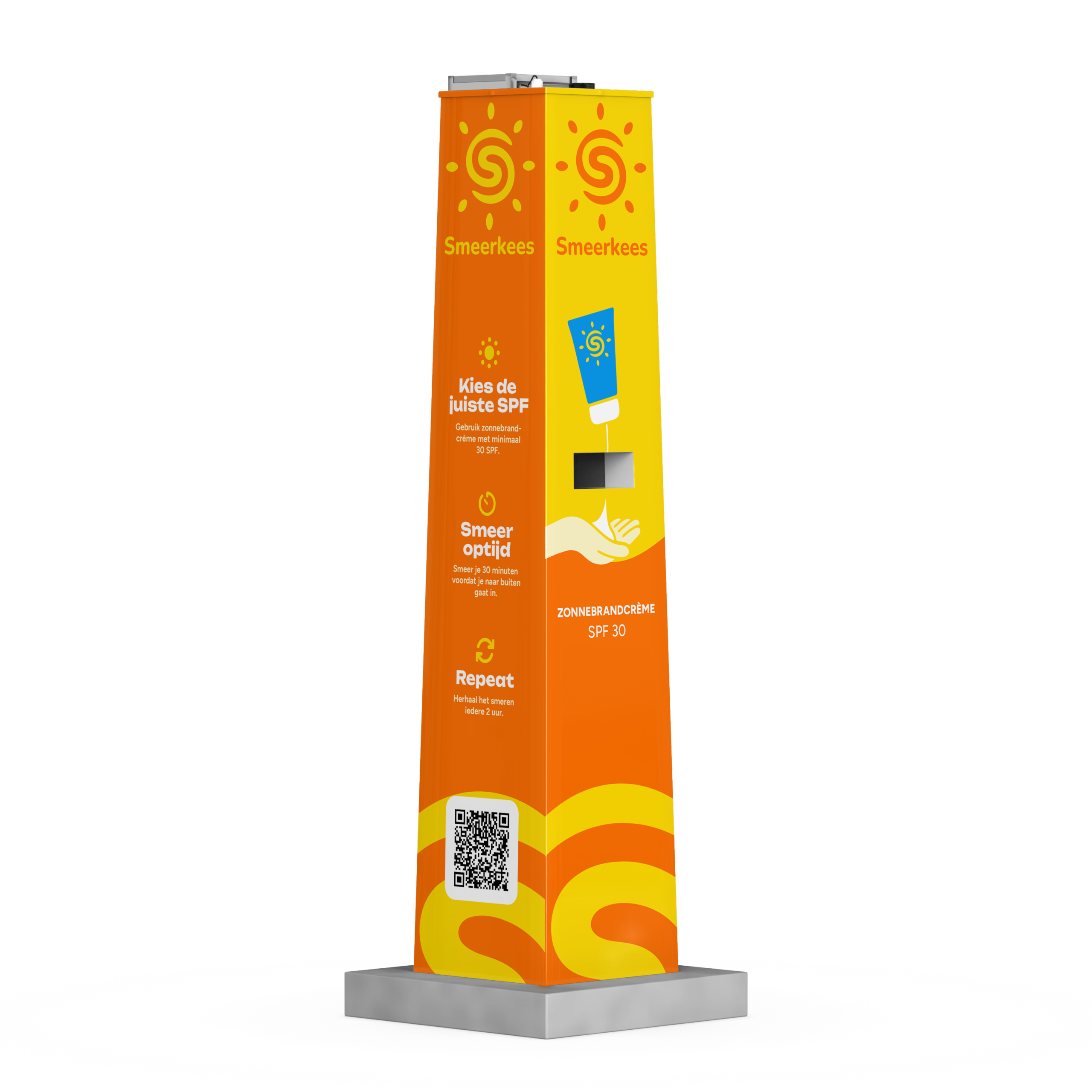 De zonnebrandpaal van Smeerkees is de ideale oplossing om zonnebrandcrème toegankelijk te maken op plekken waar mensen vaak vergeten zich in te smeren. De zonnebrandpalen zijn perfect geschikt voor gebruik in openbare ruimtes, tijdens evenementen, bij sportclubs, strandtenten, pretparken en andere recreatiegebieden. Ze bieden niet alleen een praktische oplossing, maar zijn ook een uitstekend middel voor Out-of-home marketing. Door de uitgebreide personalisatiemogelijkheden kunnen bedrijven hun merk zichtbaar maken en tegelijkertijd een positieve bijdrage leveren aan de gezondheid.